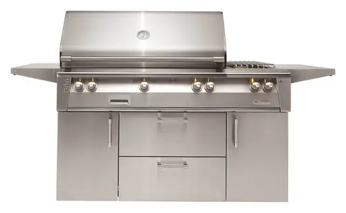 Alfresco 56 inch Deluxe Cart Grill 3 Burner, Side Burner, Rotis, Double Door, Double Drawer