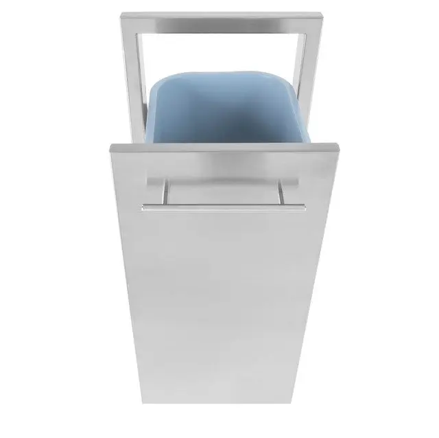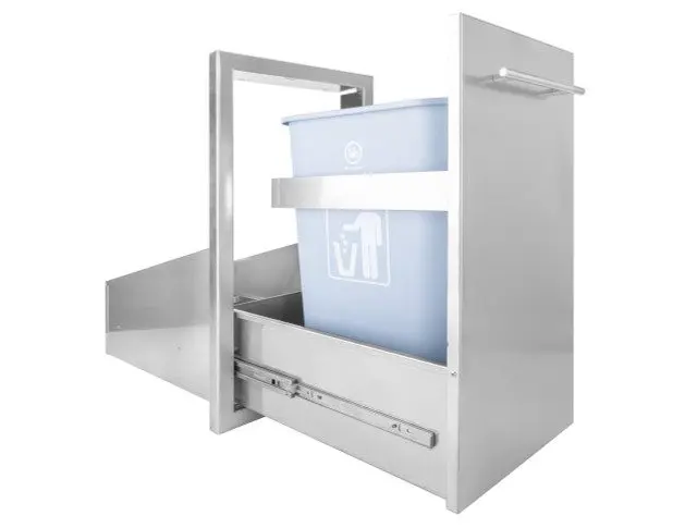 The outdoor trash pull out comes with the plastic basket. The full extension drawer Glides create easy access to empty the basket. All Pro stainless-steel doors and drawers are constructed premium 316 stainless steel. Designed specifically for all outdoor environments, these outdoor BB Q accessories are double-Wall constructed for stability. The stylish raised flange was designed to be compatible with any outdoor kitchen cabinet. All handles are also 304 stainless steel not zinc plated like most other accessory lines. These are premium products at budget prices.